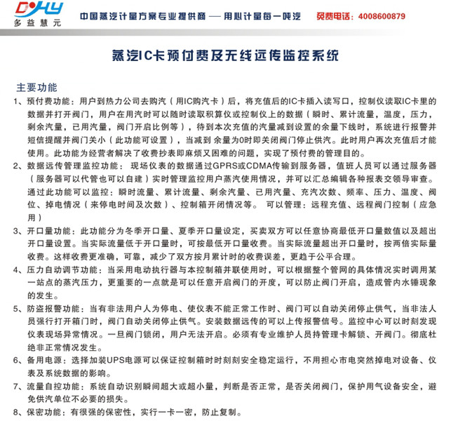 13、提示報警功能:汽、水量小于設定值控制箱會(huì )自動(dòng)發(fā)出報警,提示用戶(hù)及時(shí)充值。